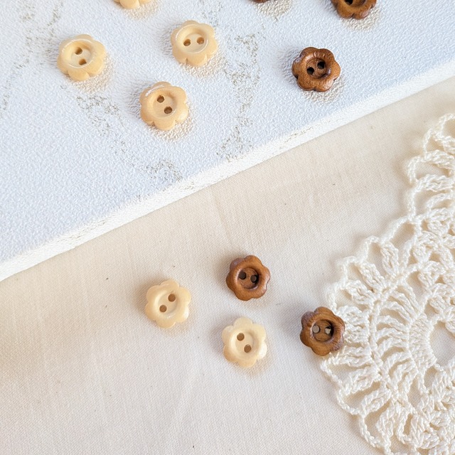ホワイトとアイボリーの 小さなお花のカタチのボタン。 ちょっぴり立体感のある形と シェルみたいな独特のツヤ感ががとっても可愛いです。 サイズ1.3㎝×1.3㎝程度。 ナチュラルな布小物のポイントにしたり、 お洋服に取り入れたり。。 小さ目サイズなので、ドール服やぬいぐるみにも‥♡ 4個セットで140円で販売いたします。 海外製造品につき、作りが粗い場合がございます。 ご理解の上ご購入ください。 中国製 サイズ:約12㎜×12㎜ カラー:ホワイト アイボリー