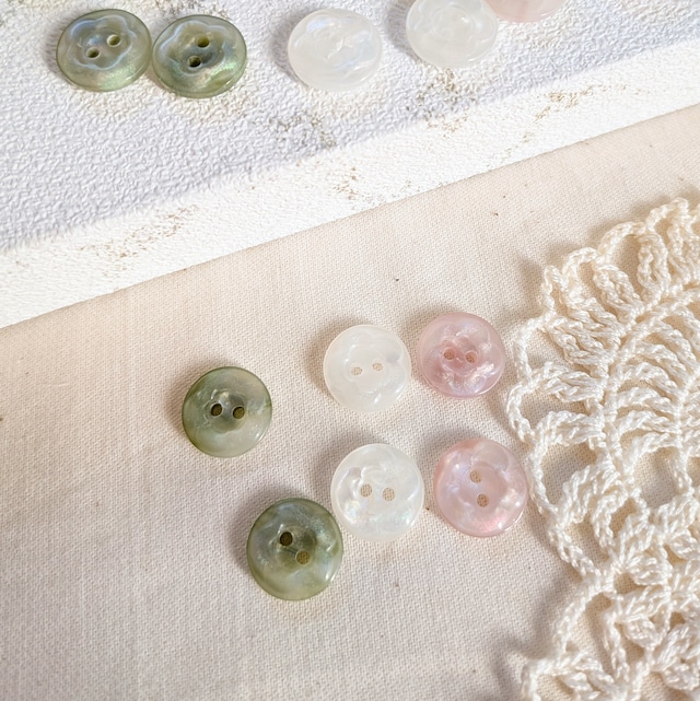 クリアマーブルの小さな丸いボタン。 よく見るとセンターはお花のカタチになっている珍しいカタチです。 ツヤツヤでオーロラ感もあるキャンディみたいな可愛い質感。 ちょっぴり大人っぽい落ち着いたカラーも素敵ですよ♡ 2つ穴タイプです。 サイズ1.15㎝×1.15㎝程度。 ナチュラルな布小物のポイントにしたり、 お洋服に取り入れたり。。 小さ目サイズなので、ドール服やぬいぐるみにも‥♡ 3色展開。 同色の4個セットで150円で販売いたします。 海外製造品につき、作りが粗い場合がございます。 ご理解の上ご購入ください。 中国製 サイズ:約11.5㎜×11.5㎜ カラー:グリーン・ホワイト・ピンク
