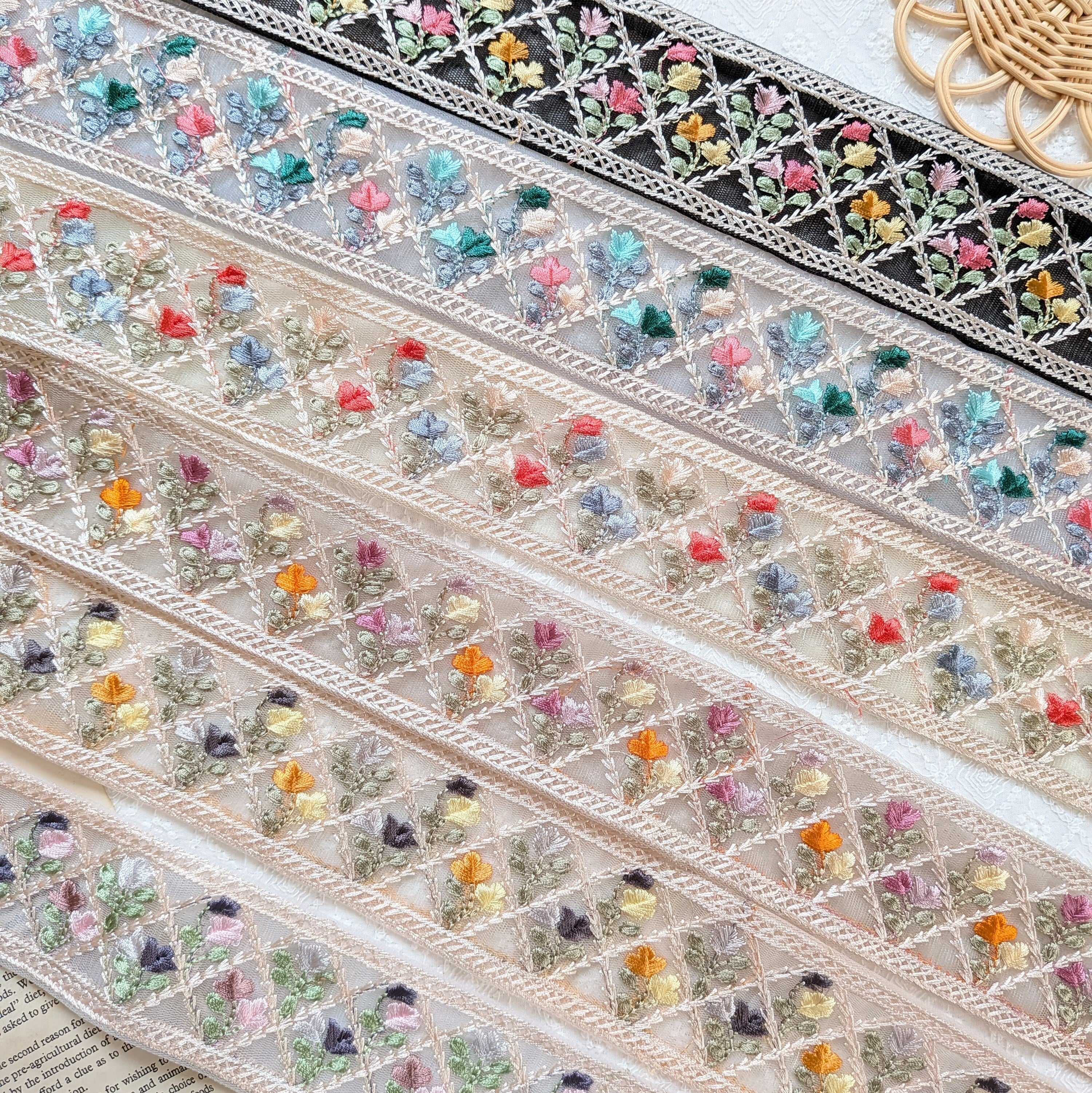 幅5.5㎝*格子に2色のお花のインド刺繍リボン❁*・50㎝あたり