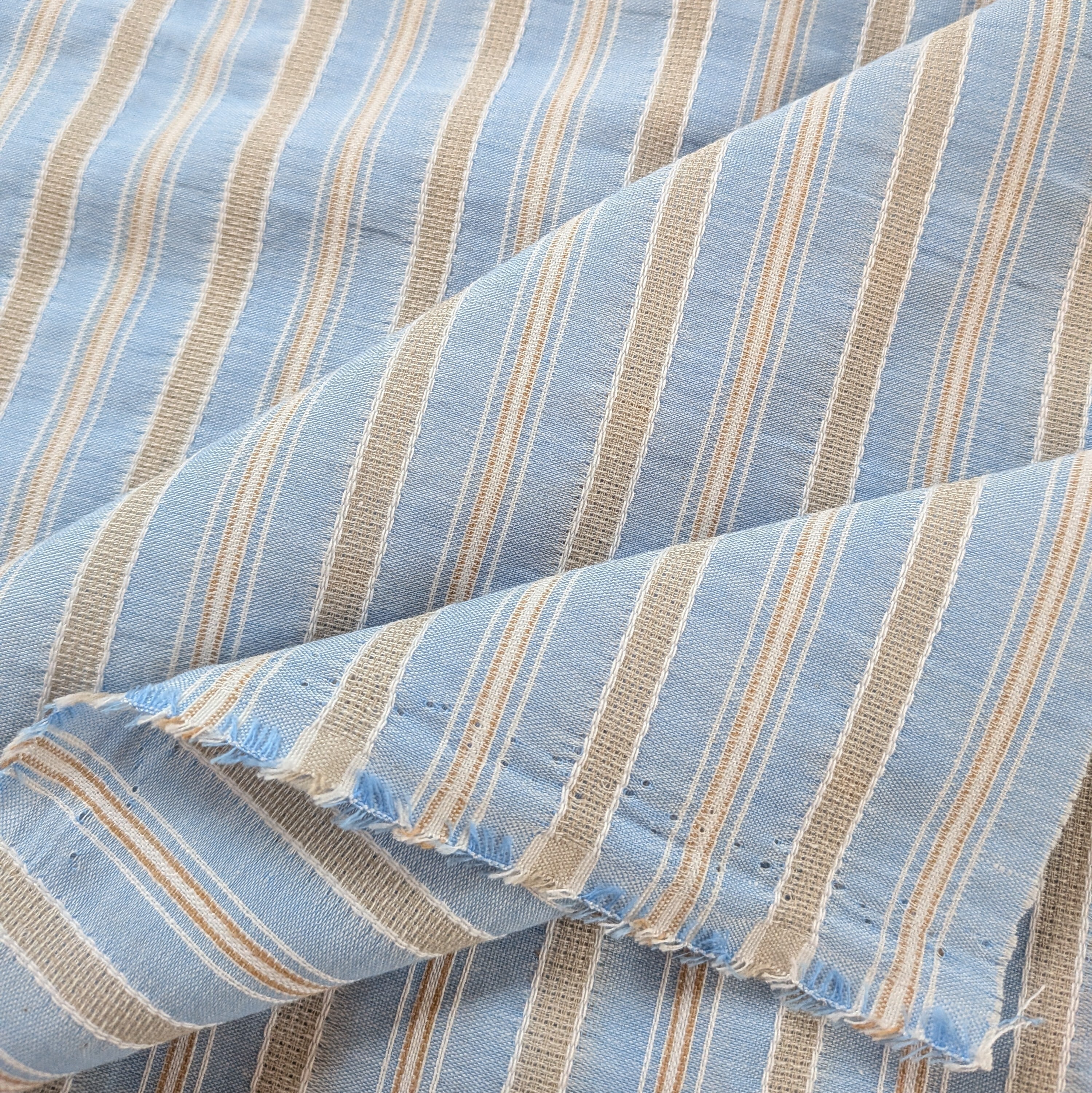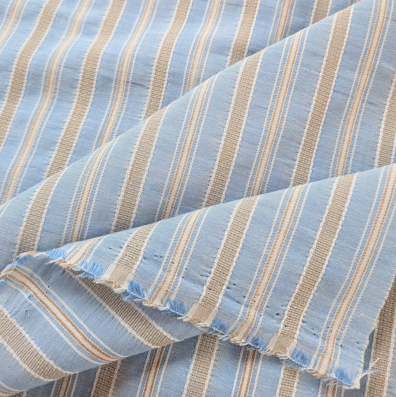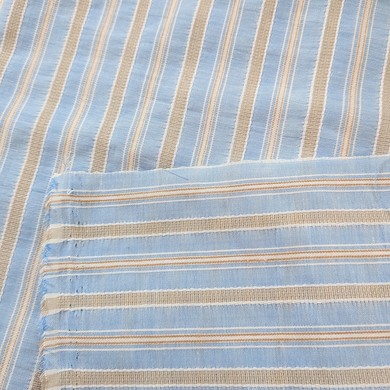 優しいライトブルーとベージュのストライプ柄が